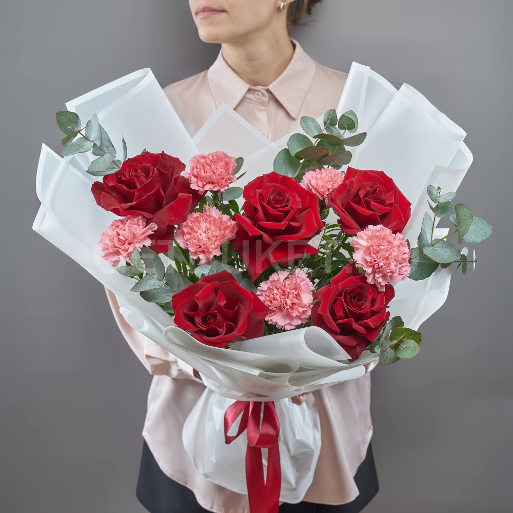 Букет из красных роз с гвоздиками и эвкалиптом