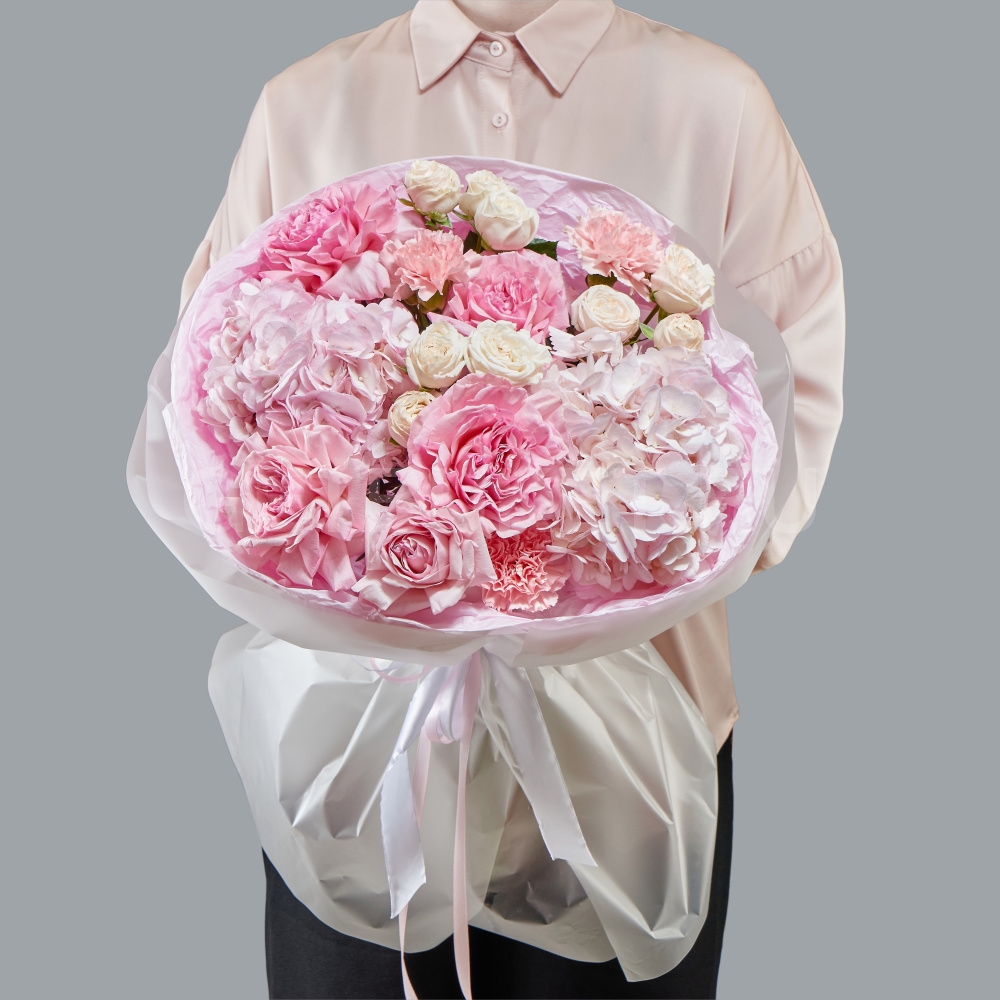Букет из роз, гвоздик и розовой гортензии с эустомой13 900 ₽Букет из роз, гвоздик и розовой гортензии с эустомой 13 900 ₽ -