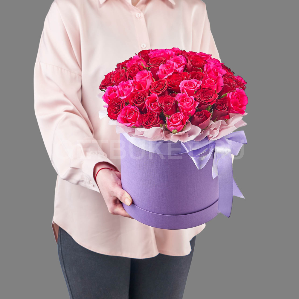 Композиция из красно-розовых кенийских роз в шляпной коробке