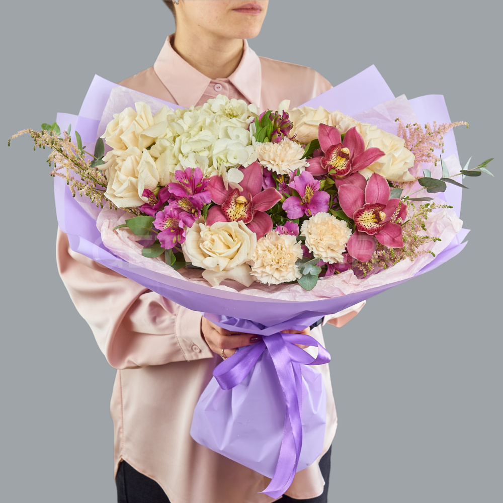 Букет белых роз, гвоздик и гортензии с орхидеей