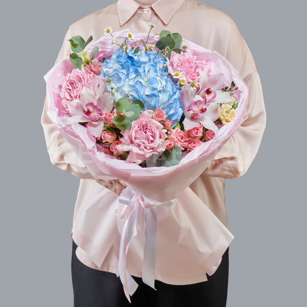 Букет из роз, гвоздик и розовой гортензии с эустомой13 900 ₽Букет из роз, гвоздик и розовой гортензии с эустомой 13 900 ₽ -