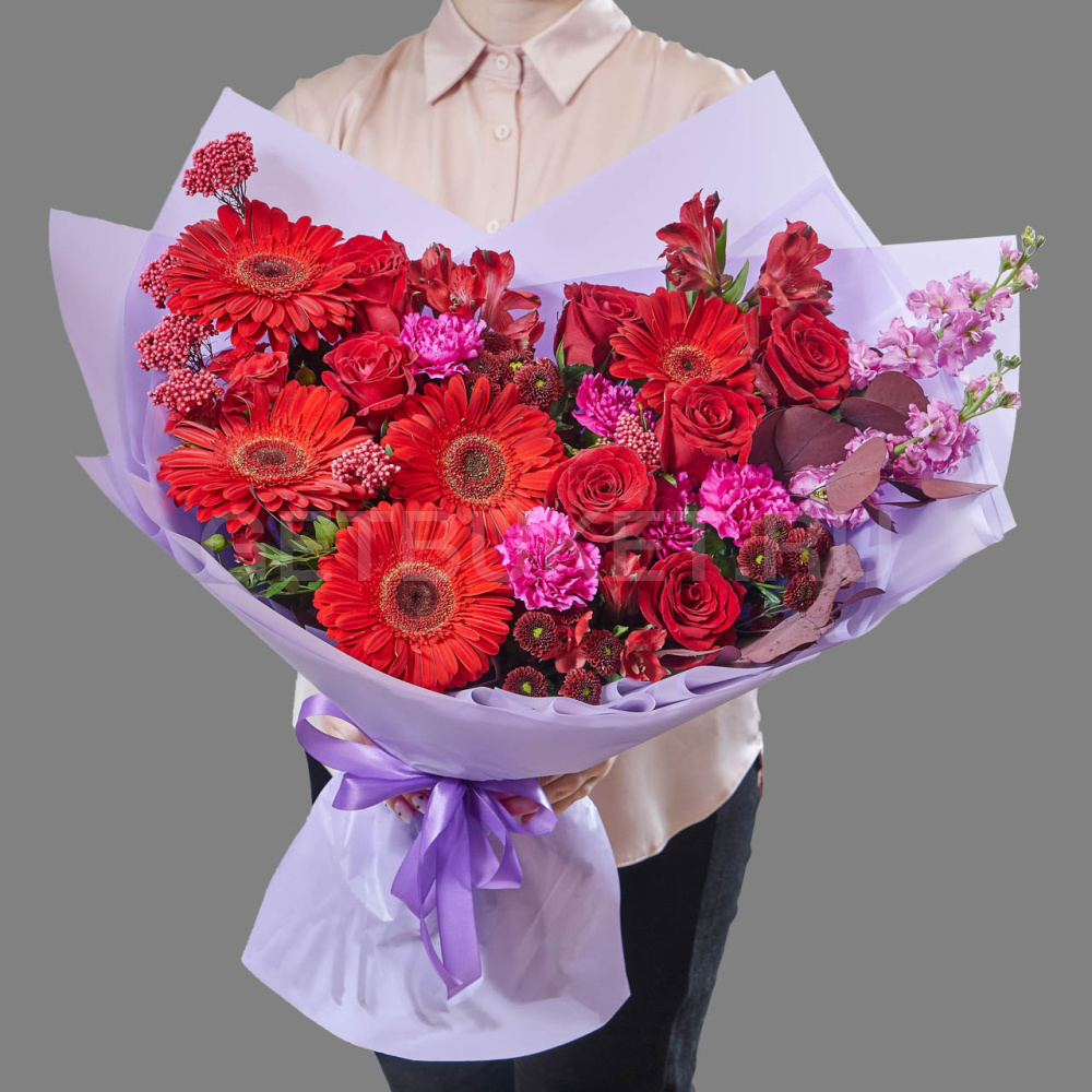 Букет из хризантем, красных роз и маттиолы7 770 ₽Букет из хризантем, красных роз и маттиолы 7 770 ₽ -