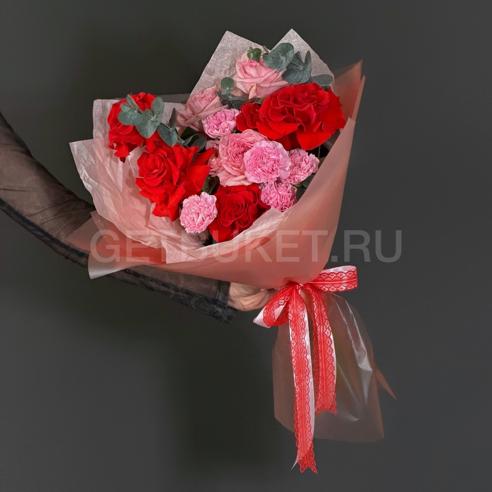 Букет из роз с эвкалиптом и гвоздикой